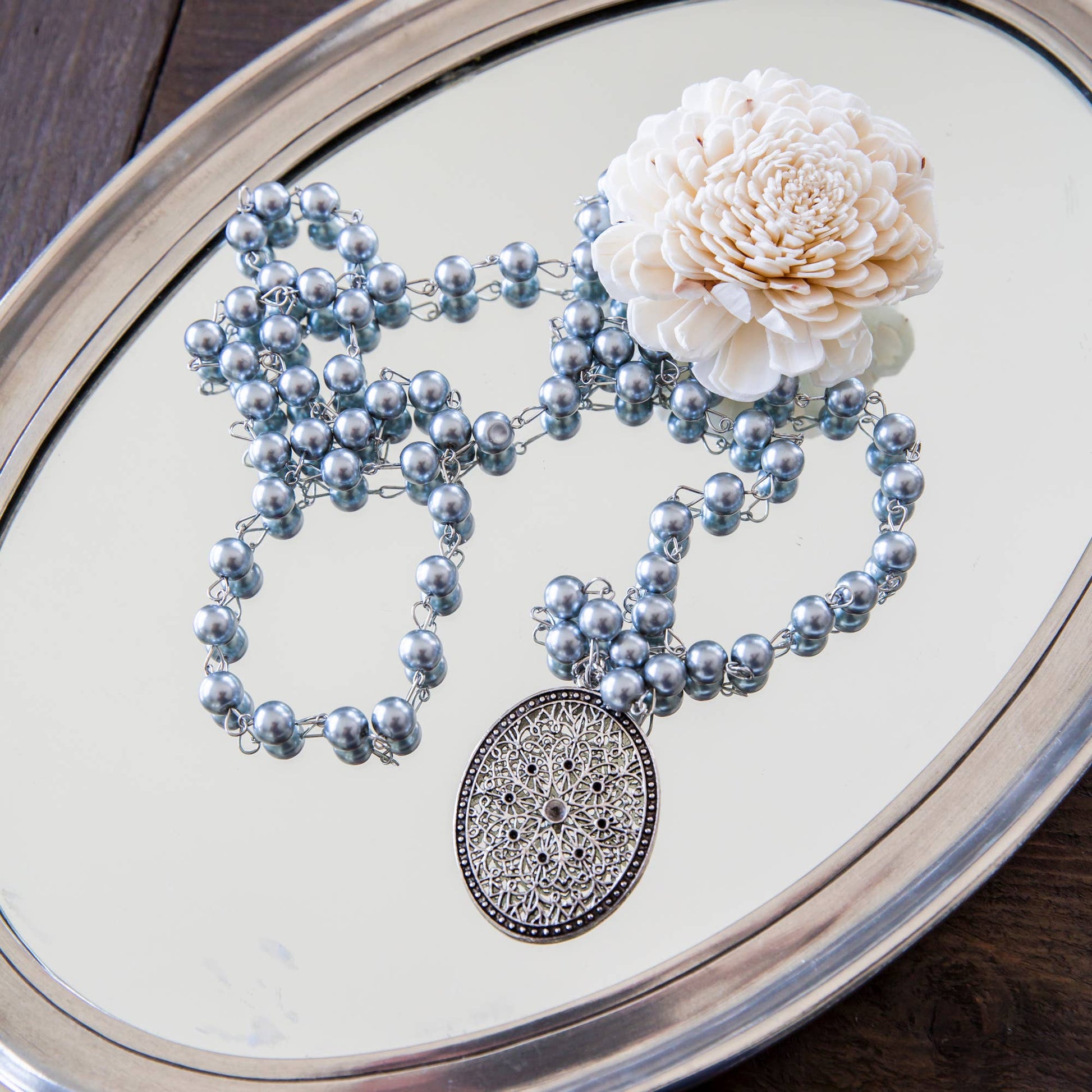 Bring Summer into your wardrobe with out turquoise colored beaded necklace with an oval pendant. Inspired by the gorgeous blue waters of Lake Garda in Northern Italy, this beautiful piece adds a pop of colors to any outfit!