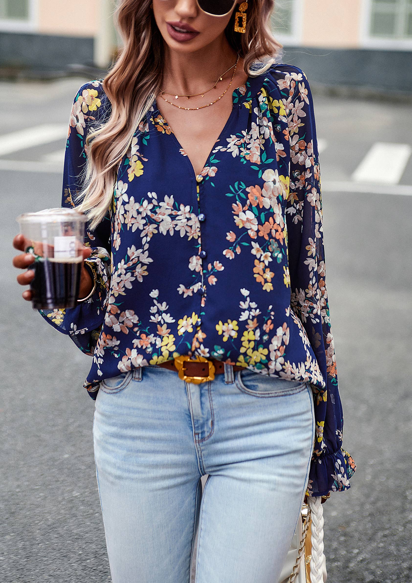 ePretty - Floral Button Down Long Sleeve Blouse SZ25-TP32012: Beige / L