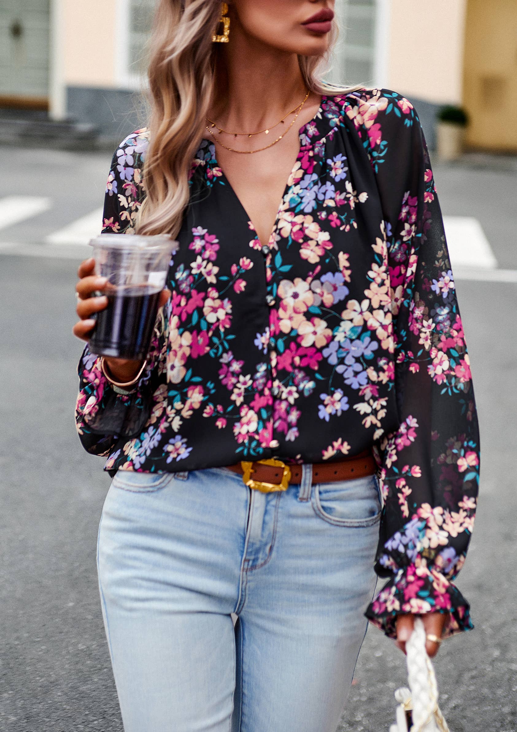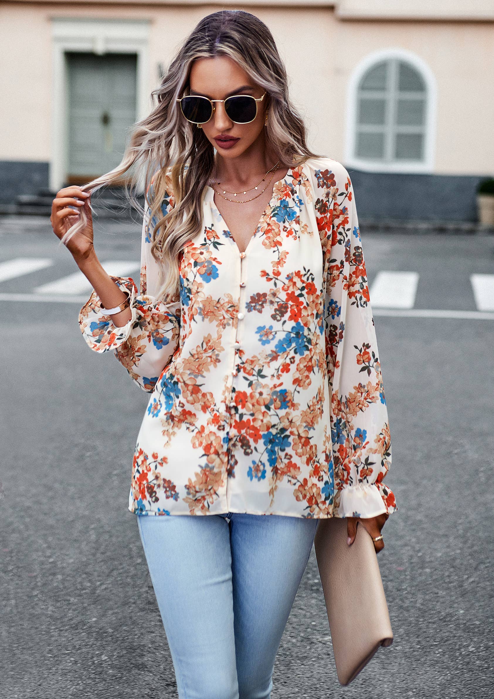 ePretty - Floral Button Down Long Sleeve Blouse SZ25-TP32012: Beige / XL
