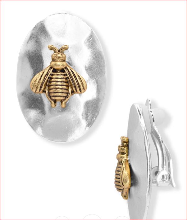 Intricate bumblebee charms are nested on top of elegant oval clip on earrings that have been both expertly hammered and polished to perfection to create these elegant earrings.
