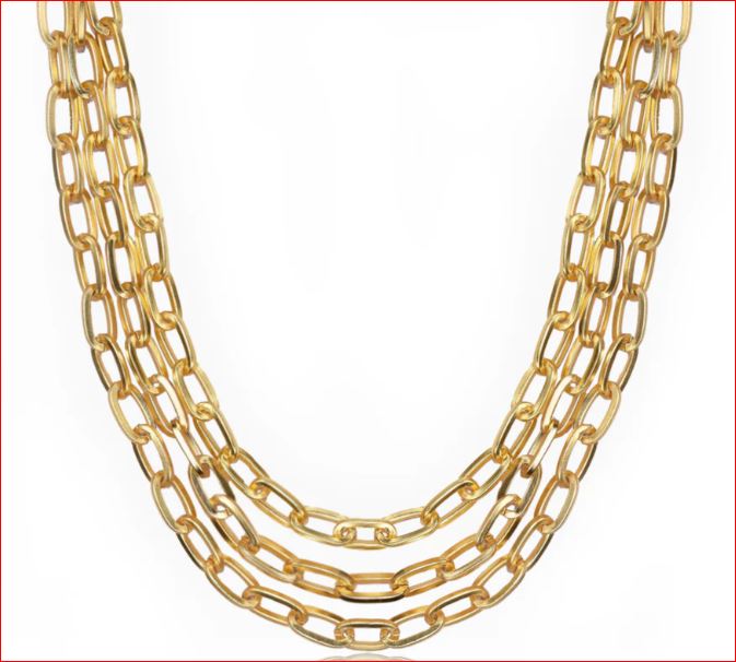Multi-layer necklace featuring three layers of polished paperclip chain.