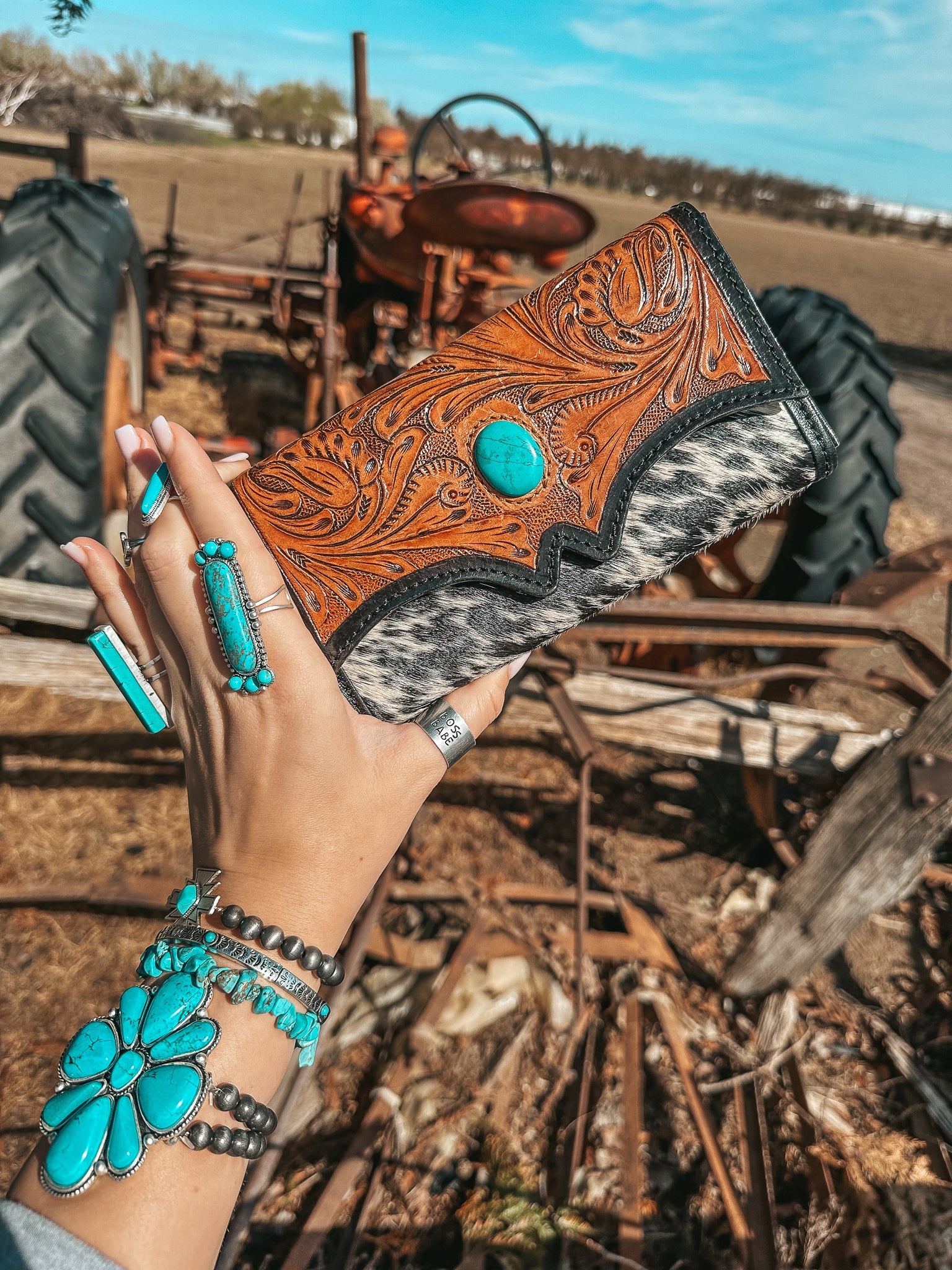 Luxury meets Western! My heart is spinning for these luxe wallets. This is the perfect date night grab. She features a beautiful tooled flap, with a genuine cowhide body. A cell phoe slot in the back provides quick phone access. The full leather interior contains 12 credit card slots, one change zipper pocket, and one extra back slot.