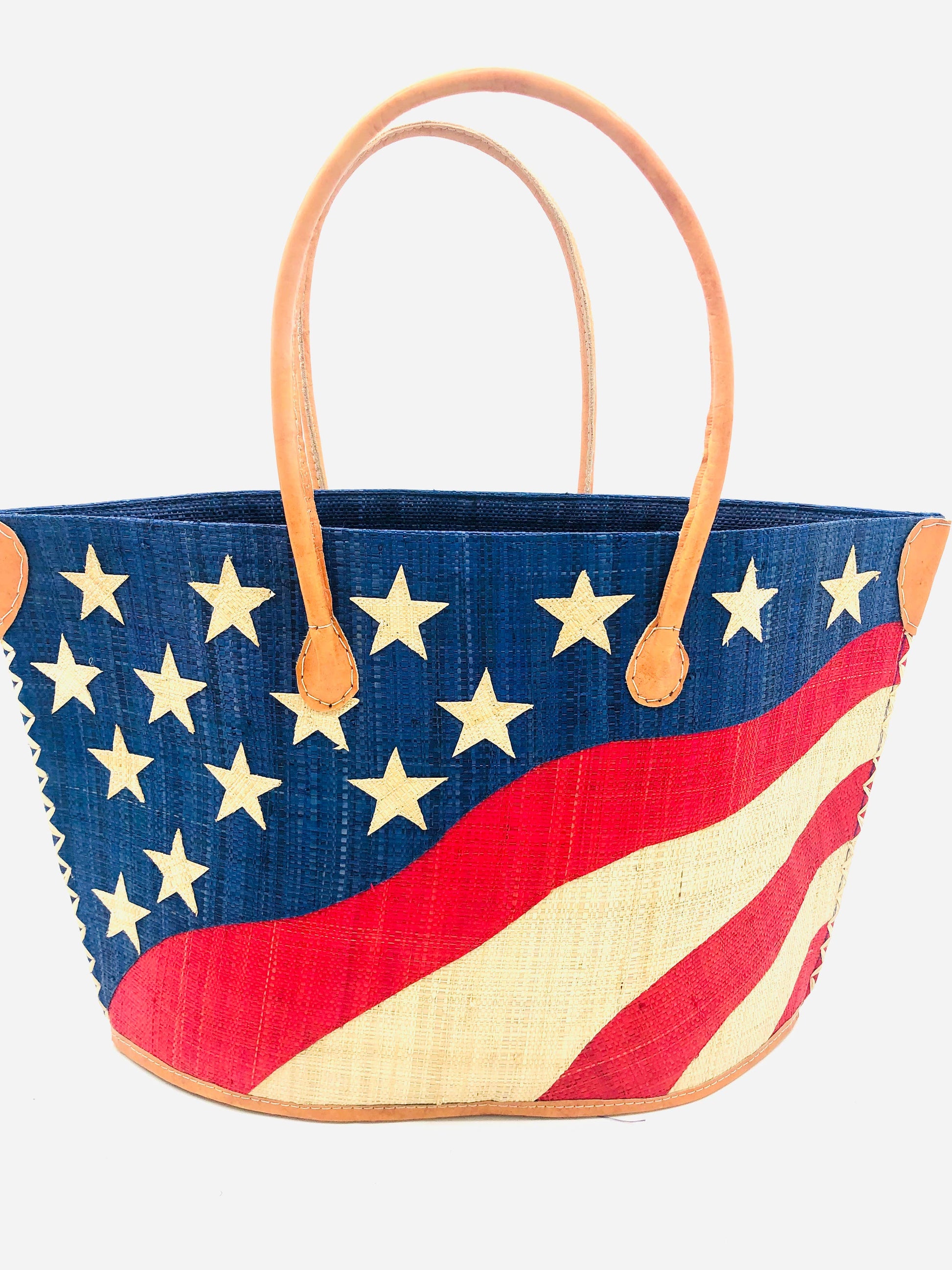 Leather handles, leather binding & drawstring closure with embroidered exterior.