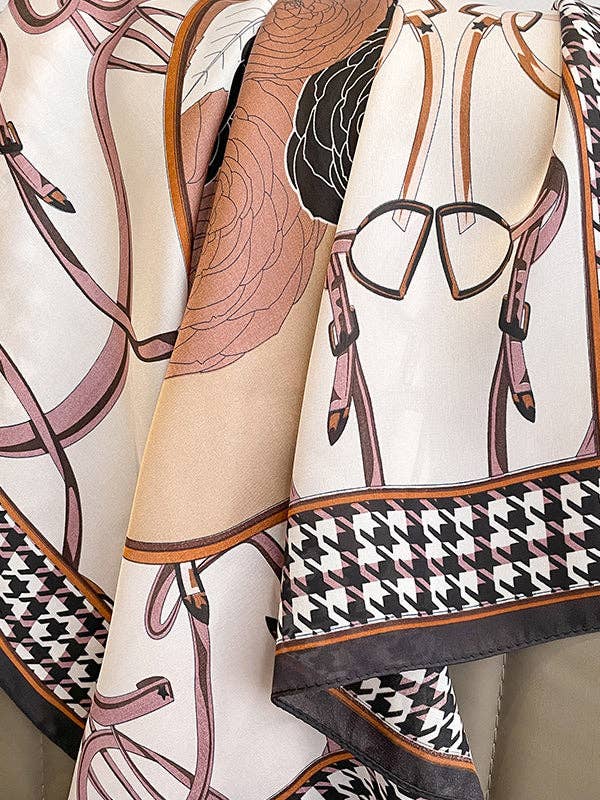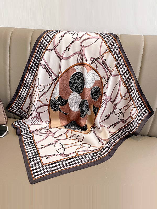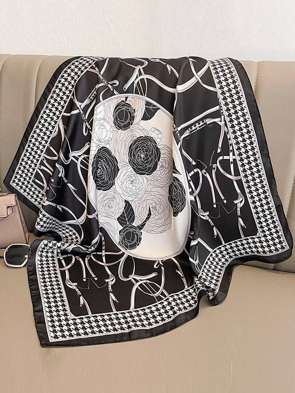 Add a touch of easy sophistication with this beautiful faux silk touch floral print and houndstooth scarf. Scarf Color BLACK, PURPLE, & PINK.