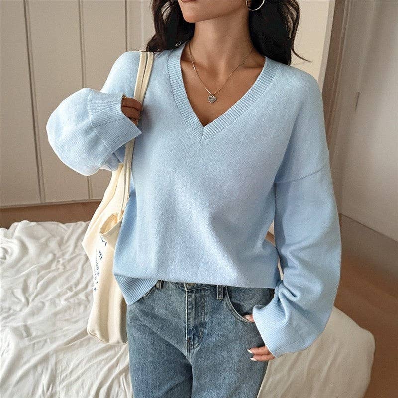 UZ V Neck Solid Color Long Sleeve Sweater: BABY BLUE