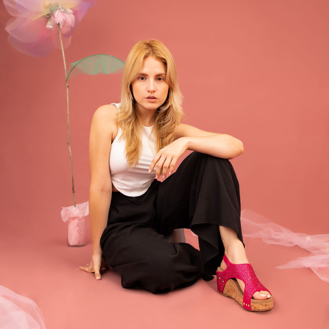 Designed to dazzle, this slingback sandal features all-over rhinestone detailing on a sculpted upper that hugs the foot. A lightweight cork wedge provides comfort and height, making Barbara your perfect pick for both casual glam and special occasions.