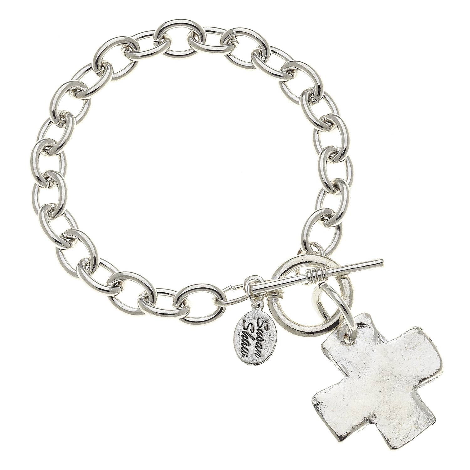Embrace elegance with the Silver Cross Bracelet by Susan Shaw. This handcast silver piece is a testament to over three decades of our unique and refined jewelry designing experience. Inspired by Northern European styling, the charm dangle bracelet is crafted with precision and care in our boutique workshop in San Antonio, TX. It's more than just a bracelet; it's a reflection of our commitment to quality, timely delivery, and customer satisfaction. Be it for a gift shop or a high-end boutique, our Silver Cross Bracelet meets the highest standards of quality and service.