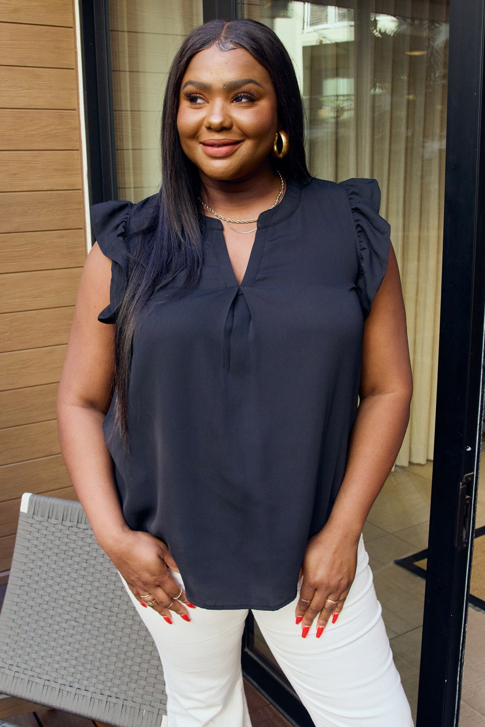 Zenana Full Size Ruffle Shoulder Notched Neck Blouse
